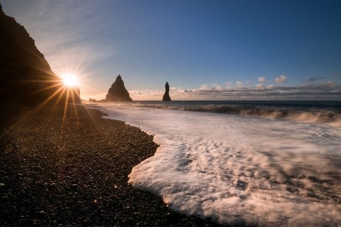 - Чёрный пляж Рейнисфьяра — драматические волны, базальтовые арки и птицы