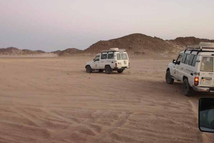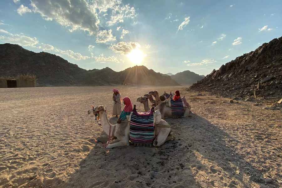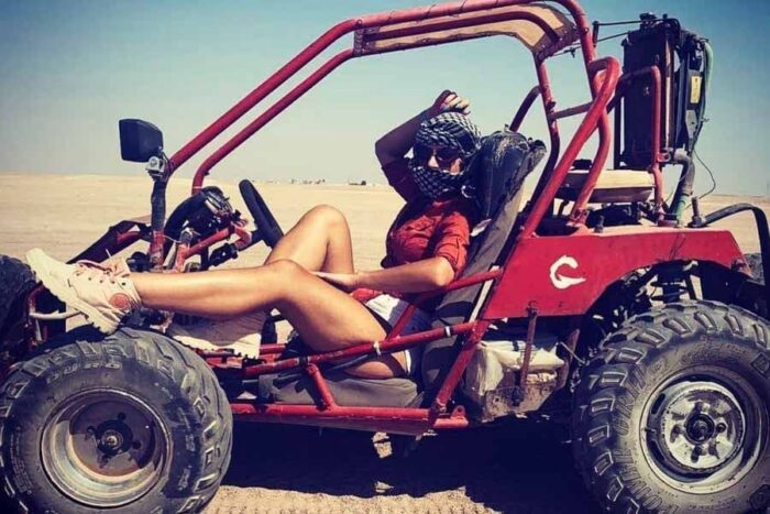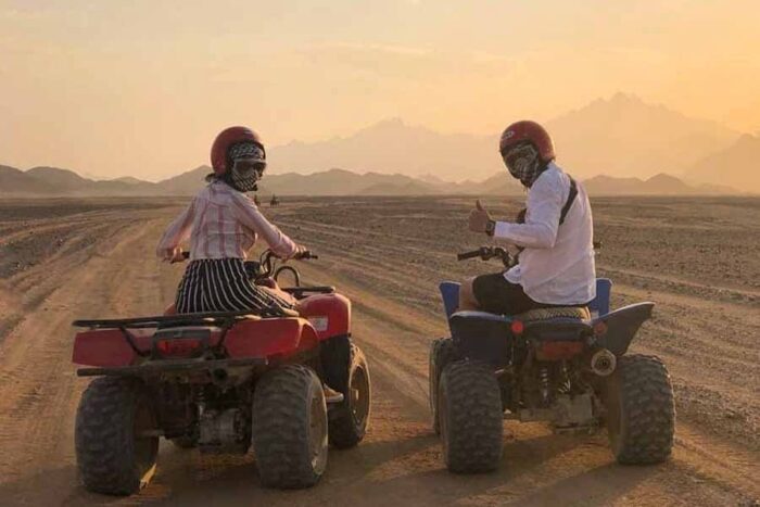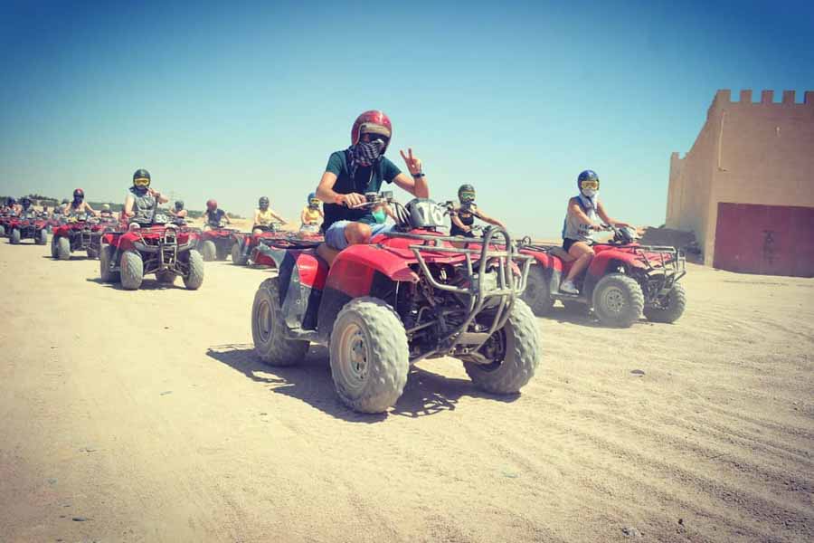 В 12:30 выезд из отеля. Отправляемся из Хургады в пустыню. Поездка на джипе, 25 километров по пустыне, через дюны и холмы к деревне бедуинов. Фотоостановки в красивых местах. После этого вы прокатитесь на квадроциклах (около 45 минут). Далее вас ожидает катание на верблюдах и экскурсия по деревне, где вы познакомитесь с традиционным бытом бедуинов. Затем у вас будет время прокатится на багги (около 15 минут). Встреча заката в пустыне. Возвращение в отель около 18:00.